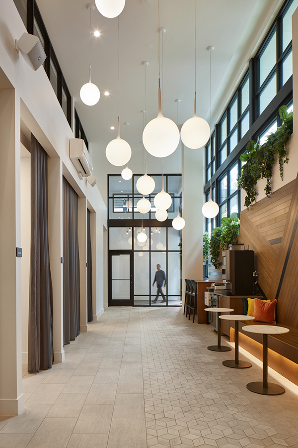 The lobby core, located at the “center line” of the building, flexes in use, blurring the lines between leasing, circulation, and remote workspaces. Illuminated by a skylight, resident mail services blend with huddle seating and a banquet perch—offering opportunities for ad-hoc meetings, connecting with friends, or being together alone. The leasing and residential entries are connected through a dynamic wood pattern that wraps the core of the space. A playful floor tile, radiating in scale and color from the “center line” of the building, assists with wayfinding and provides subtle cues to the connection between three entry points. The lobby integrates biophilic design strategies through the use of wood, natural stone textures, plant life, and colors found in nature—increasing resident connectivity to nature for a more productive and healthier built environment.