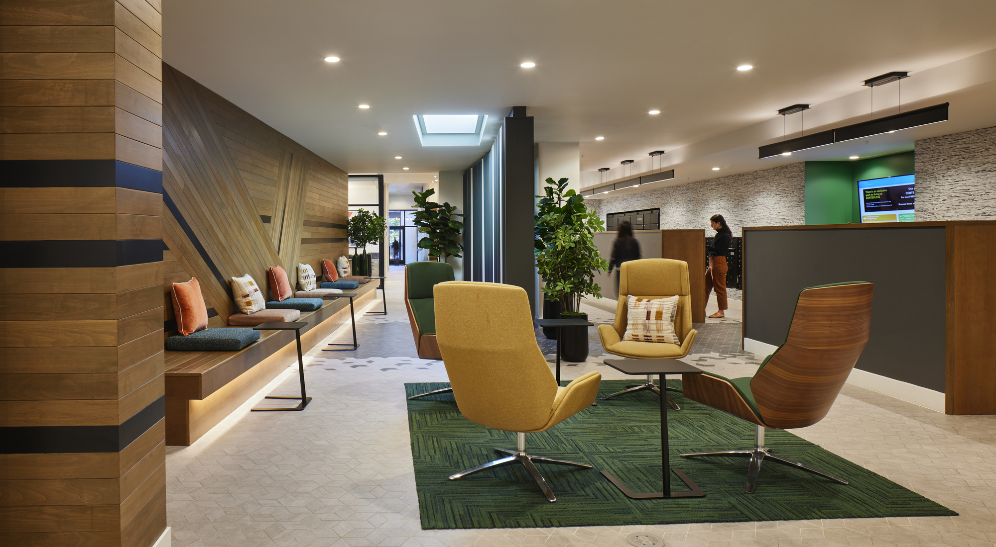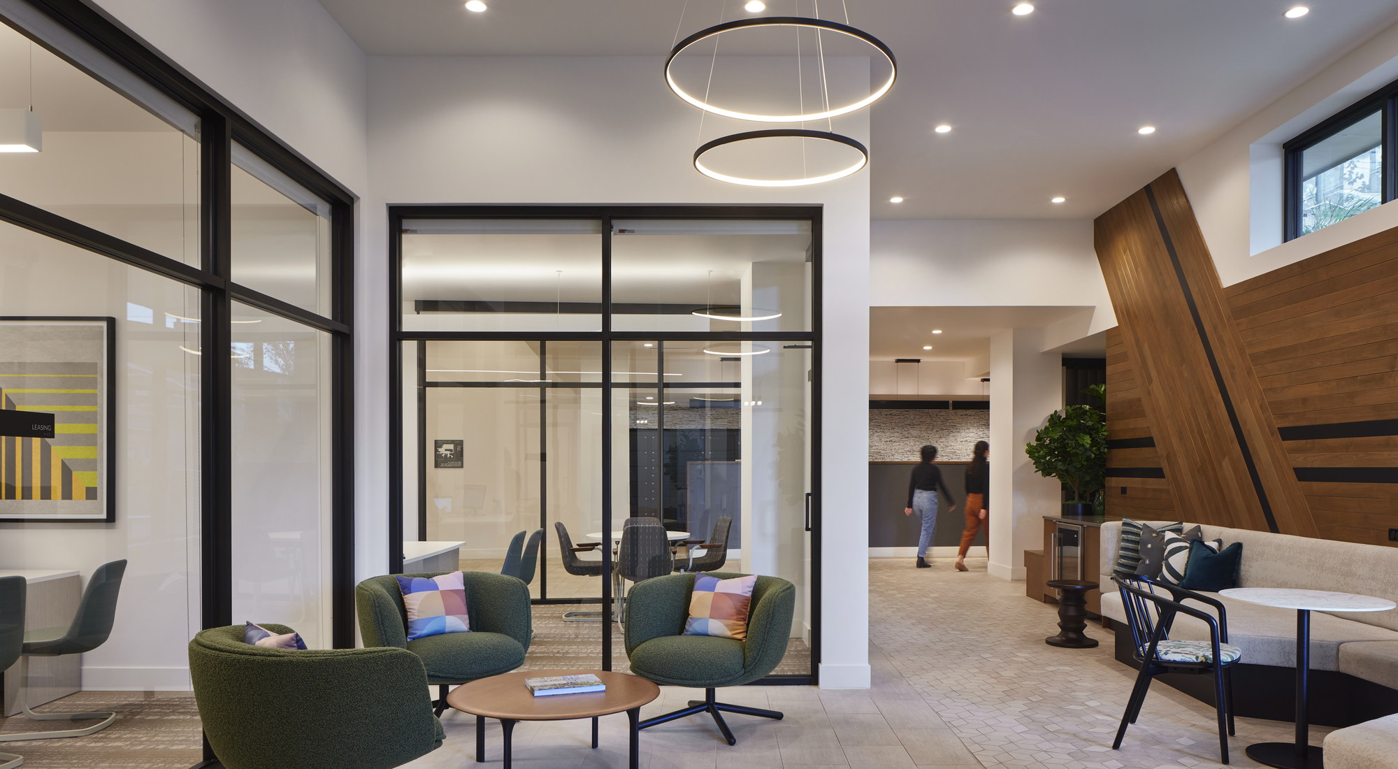 The lobby core, located at the “center line” of the building, flexes in use, blurring the lines between leasing, circulation, and remote workspaces. Illuminated by a skylight, resident mail services blend with huddle seating and a banquet perch—offering opportunities for ad-hoc meetings, connecting with friends, or being together alone. The leasing and residential entries are connected through a dynamic wood pattern that wraps the core of the space. A playful floor tile, radiating in scale and color from the “center line” of the building, assists with wayfinding and provides subtle cues to the connection between three entry points. The lobby integrates biophilic design strategies through the use of wood, natural stone textures, plant life, and colors found in nature—increasing resident connectivity to nature for a more productive and healthier built environment.