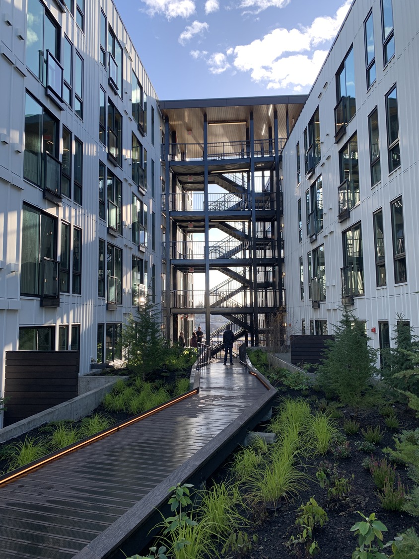 The Hemlock’s three residential bars step up the hillside as the surrounding context transitions from Greenwood’s premier Commercial street to a dense residential neighborhood. The middle bar is pivoted towards the most prominent corner at 87th and Greenwood Avenue connecting the three volumes and creating two opposing wedge-shaped courtyards for respite. The landscape references Greenwood’s history as a bog. Boardwalks float between deep bioretention planters and patios sunken into the bioretention create an immersive experience for residents.